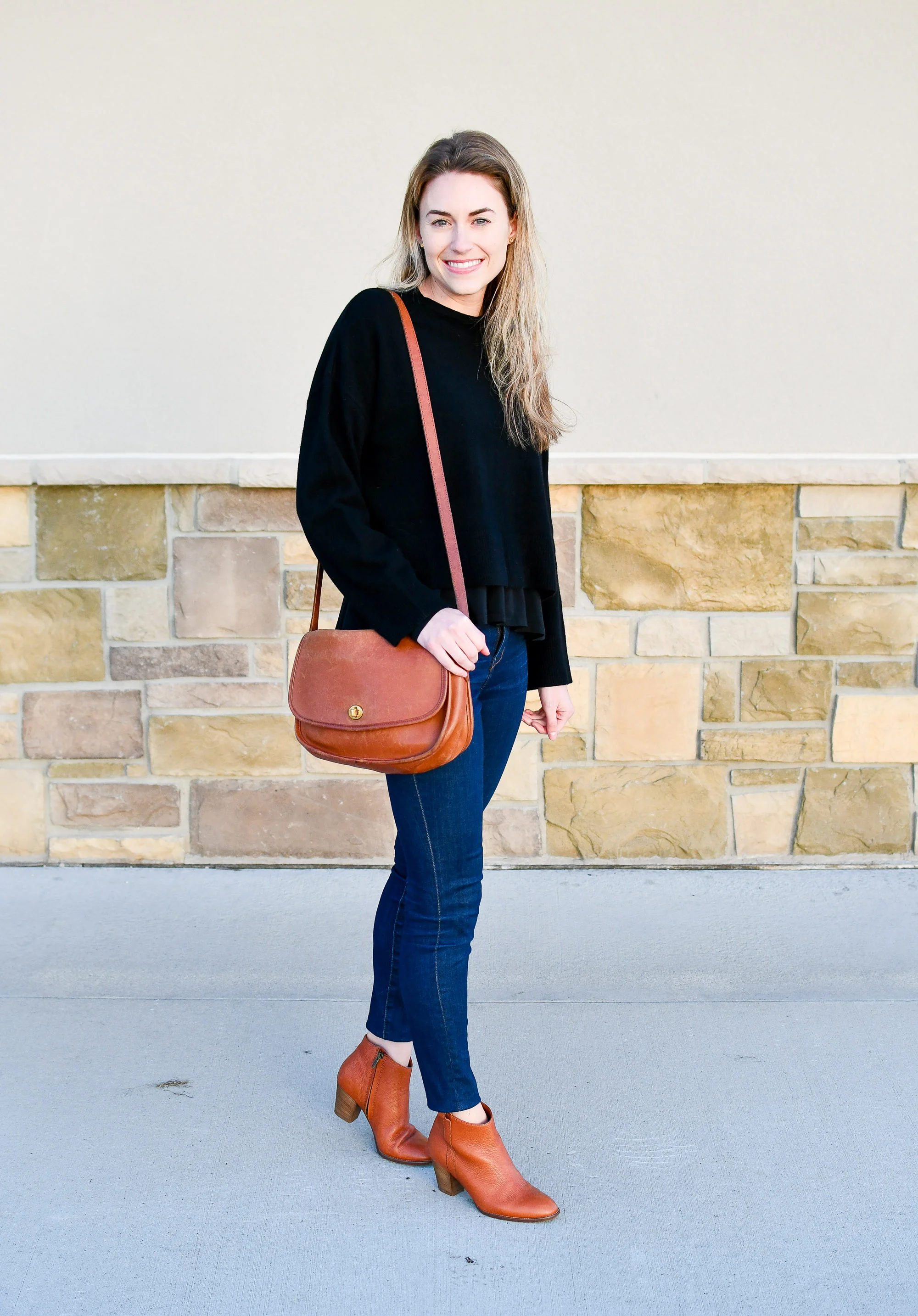 I definitely had some fun with this outfit! I layered a long-sleeved peplum top under my new cashmere sweater from Grana. This sweater is cropped (and loose) enough that it required some sort of layer underneath, so I added an interesting black top versus something more "safe" or predictable. I love how they look like they could be one piece! The cognac boots and bag lighten it up and tie it all together.