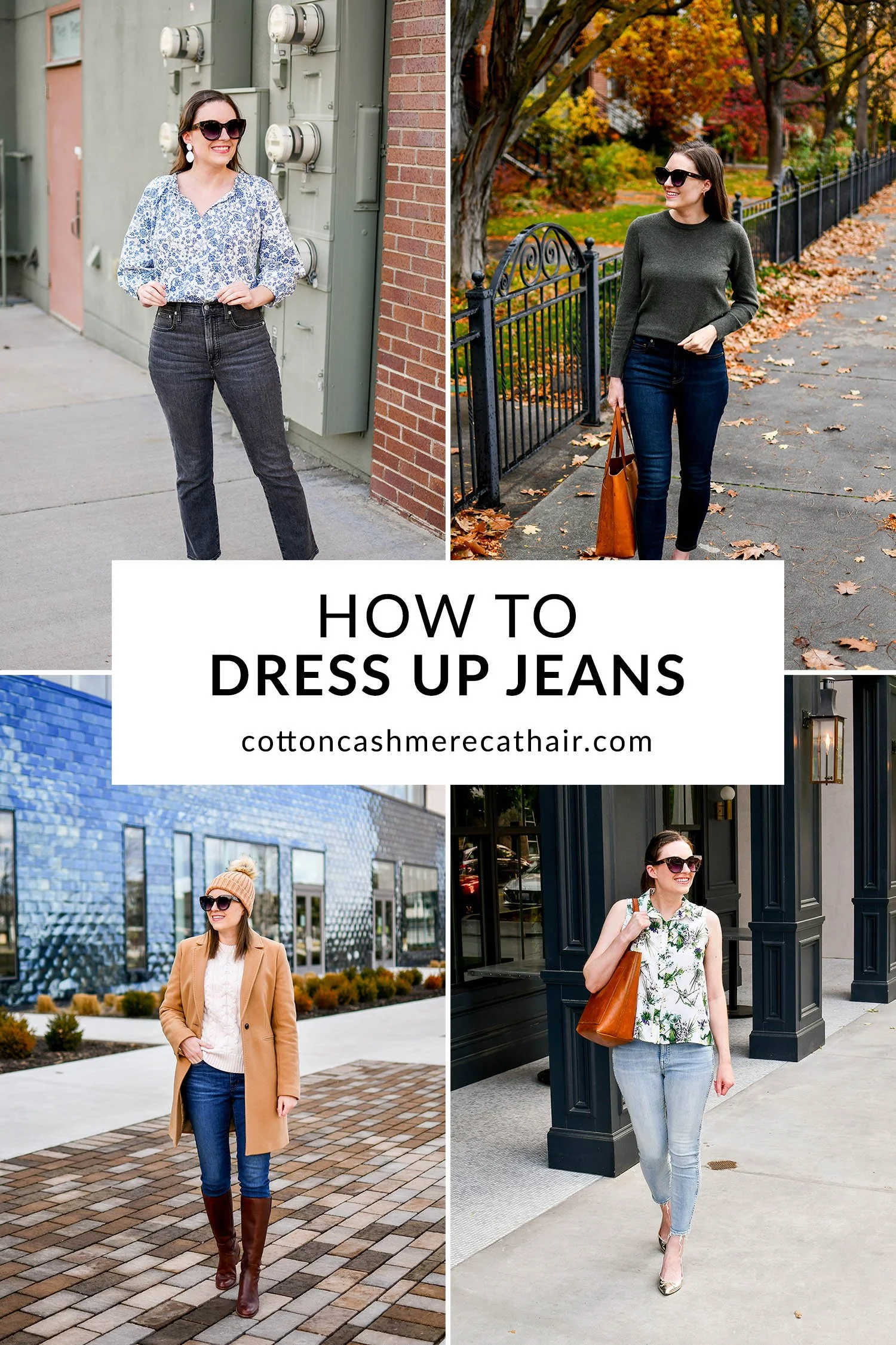 To make your jeans outfit feel more dressy instead of casual, there are a few style tips to keep in mind: