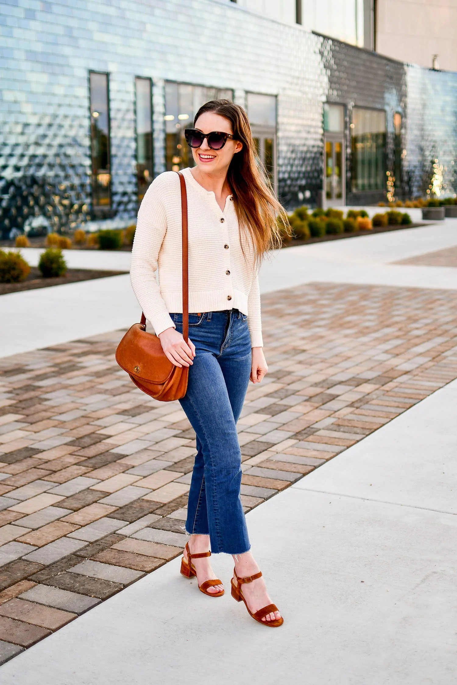 Kick crop jeans are one of my favorite styles of jeans, and even your jeans with slightly distressed hems can be dressed up a bit! (I’m personally not a fan of heavily distressed jeans.) Anchor the simple (but textured!) cardigan, jeans, and suede sandals in your outfit with a coordinating bag.